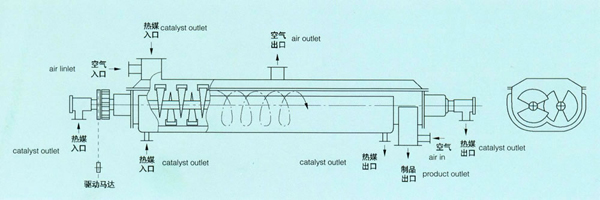 空心槳葉軸在傳動系統(tǒng)驅(qū)動下緩慢轉(zhuǎn)動,物料從進(jìn)料口進(jìn)入機(jī)內(nèi),經(jīng)緩慢轉(zhuǎn)動的空心槳葉軸輸送至出料口。物料在輸送過程同時(shí)受空心槳葉和夾套加熱而干燥。由于空心槳葉呈楔形,旋轉(zhuǎn)時(shí)使物料交替地受到壓縮(在楔形斜面處)和膨脹(在楔形空隙處),因而使傳熱面上的物料運(yùn)動激烈,而且強(qiáng)化了傳熱面上的自清潔效果,從而大大提高了傳熱系數(shù)。用于干燥的熱介質(zhì)可以是蒸氣、導(dǎo)熱油或熱水。熱介質(zhì)通過旋轉(zhuǎn)接頭進(jìn)入空心軸及槳葉。當(dāng)熱介質(zhì)改為冷卻水時(shí),該機(jī)是理想的粉體冷卻設(shè)備。