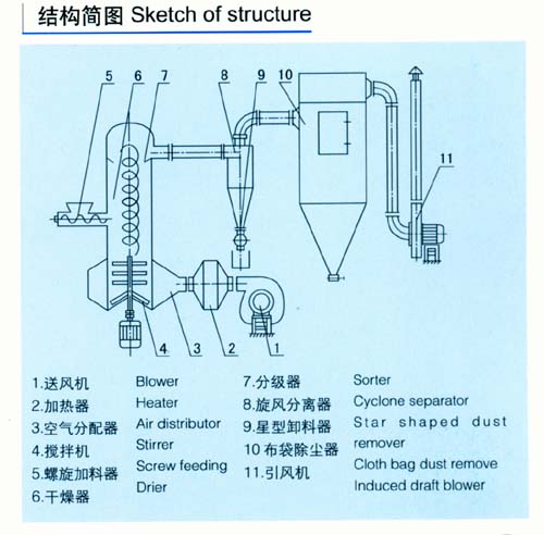 干燥氣體進入XSG系列旋轉閃蒸干燥機底部,產(chǎn)生強烈的旋轉氣流,對器壁上物料產(chǎn)生強烈的沖刷帶出作用,消除粘壁現(xiàn)象。