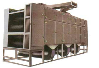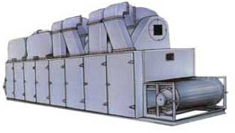 將所要處理的物料通過適當(dāng)?shù)募恿蠙C(jī)構(gòu),如星型布料器、擺動帶、粉碎機(jī)或造粒機(jī),分布在輸送帶上,輸送帶通過一個或幾個加熱單元組成的通道,每個加熱單元均配有空氣加熱和循環(huán)系統(tǒng),每一個通道有一個或幾個排濕系統(tǒng),在輸送帶通過時,熱空氣從上往下或從下柱上通過輸送帶上的物料,從而使物料能均勻干燥。